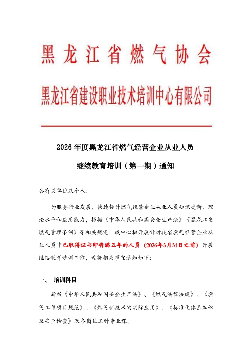 2026年度黑龙江省燃气经营企业从业人员继续教育培训(第一期)通知
