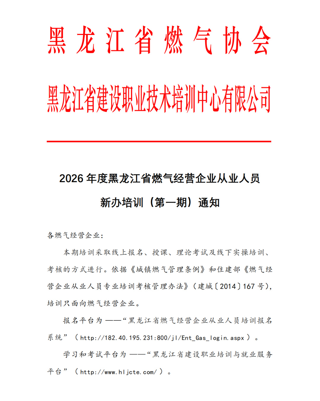 2026年度黑龙江省燃气经营企业从业人员新办培训(第一期)通知