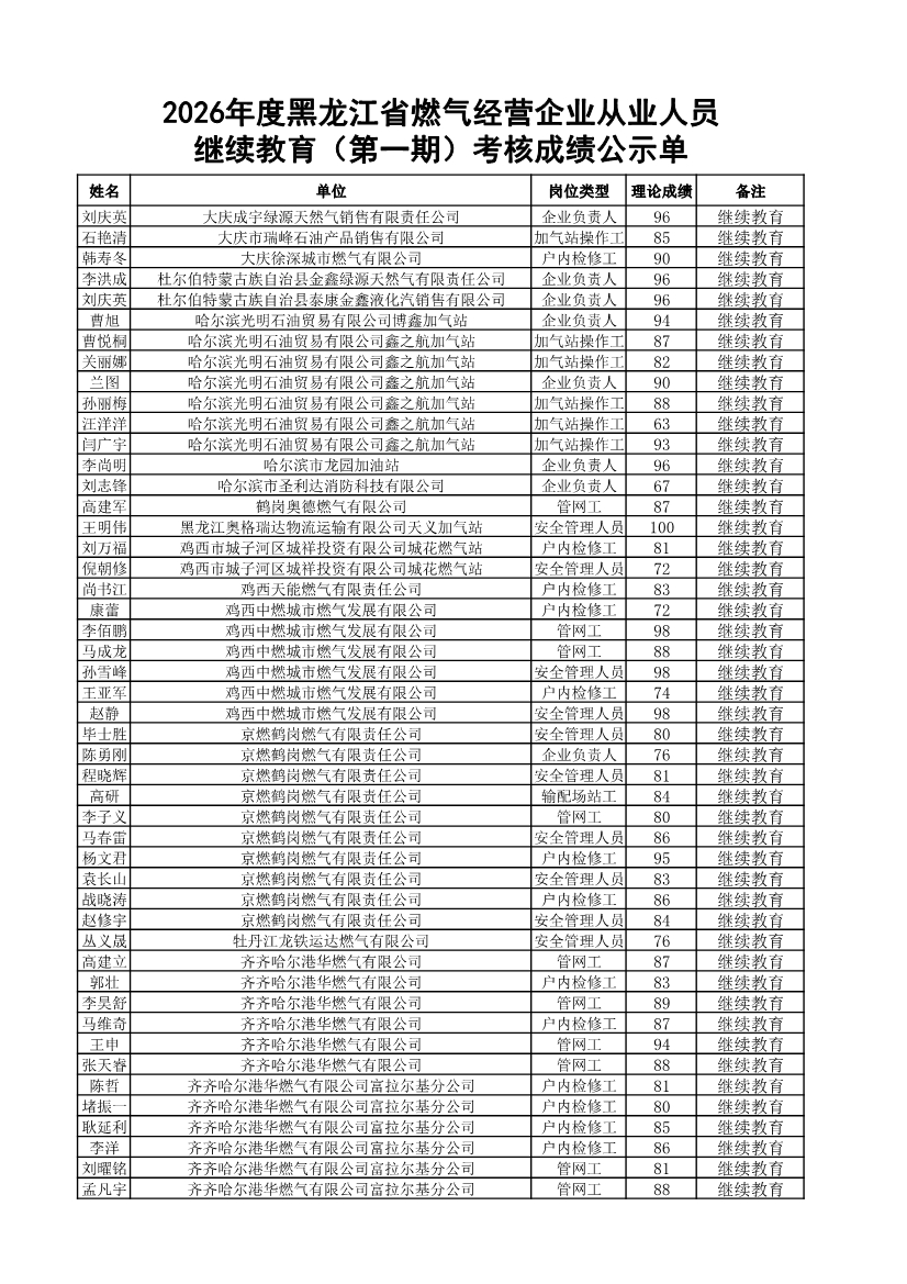 2026年度黑龙江省燃气经营企业从业人员继续教育(第一期)考试成绩公示单